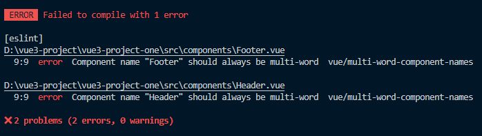 ๋ ๊ฐ ์ด์์ ๋จ์ด๋ฅผ ์กฐํฉํ์ฌ ์ปดํฌ๋ํธ๋ฅผ ๋ช ๋ช ํ๋ผ๋ vue์ ๊ถ๊ณ ์ฌํญ์ธ๋ฐ, ESLint๊ฐ ์ค์น๋์ด ์์ผ๋ฉด ๋ช ๋ฐฑํ๊ฒ ์๋ฌ๊ฐ ๋๋ค.