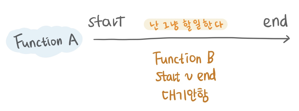 ํจ์ A๊ฐ ๋ค๋ฅธ ์ฃผ์ฒด์ธ ํจ์ B๋ฅผ ํธ์ถํ์๋๋ฐ, ํจ์ B์ ์์~๋์ ๊ธฐ๋ค๋ฆฐ ๋ค, B์ ๋ํ return๊ฐ์ ๋ฐ์์จ ํ์ ์์ ์ ์์ ์ ์ด์ด๊ฐ๋ค๋ฉด, ์ด๊ฒ์ด ๋ธ๋กํน์ด๋ผ๊ณ ํ ์ ์๋ค.