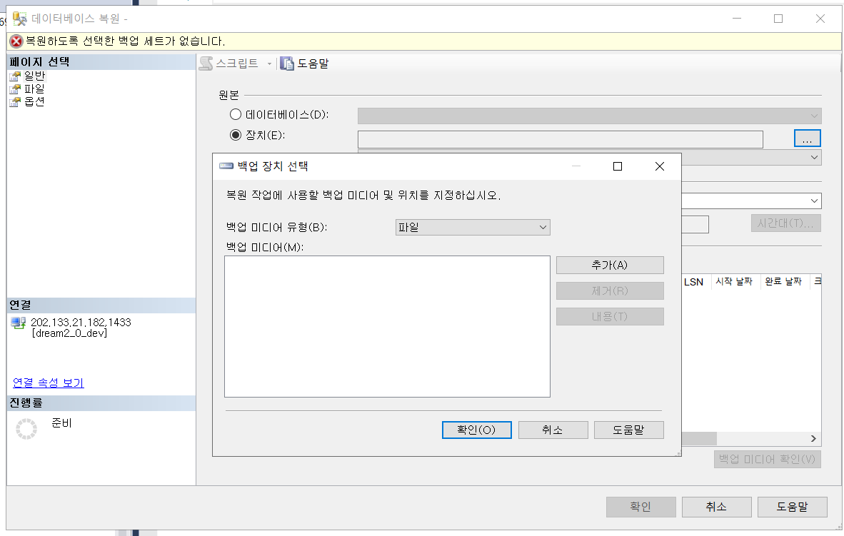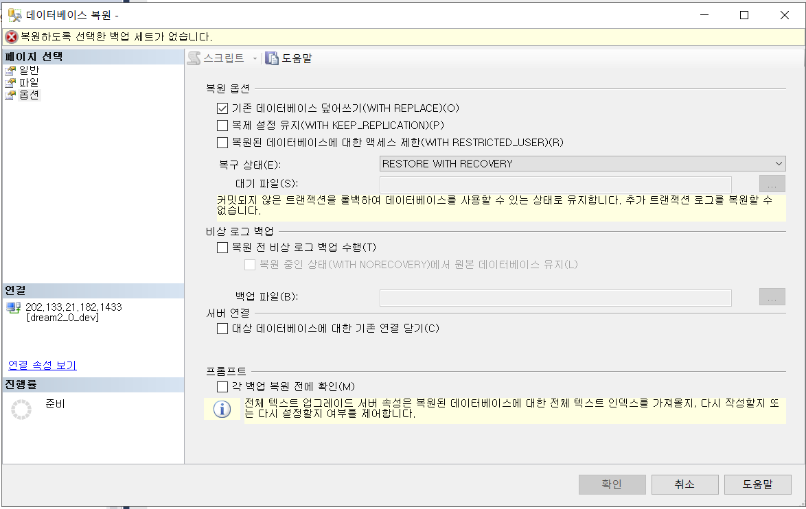 ๋ฐฑ์ ํ .bak ํ์ฅ์ ํ์ผ์ ์ค๋นํ๊ณ , ๋ณต์ํ๊ธฐ ์ ์ ๋ฐ์ดํฐ๋ฒ ์ด์ค๋ฅผ ๋ฏธ๋ฆฌ ๋ง๋ค์ด๋๊ณ ๊ฑฐ๊ธฐ์ ๋ฐฑ์ ์ ํ๋ฉด ์ถฉ๋์ด ๋จ