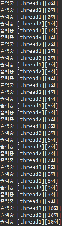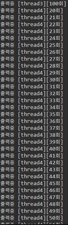 μμ κ°μ²΄μΈ Thread1~3μ΄ 100κΉμ§ μ€νλκ³ , μ€νμ΄ λλλ©΄ λ€μ κ°μ²΄μΈ Thread4κ° λλ©° 100κΉμ§ μ°λλ€.